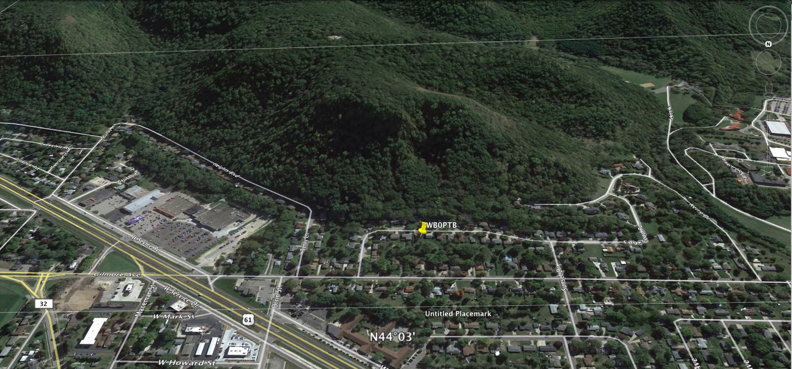 Latitude = 44.0477 ° N, Longitude = 91.6837 ° W Topographic location WB0PTB Google Earth Looking SOUTH Station Photos |