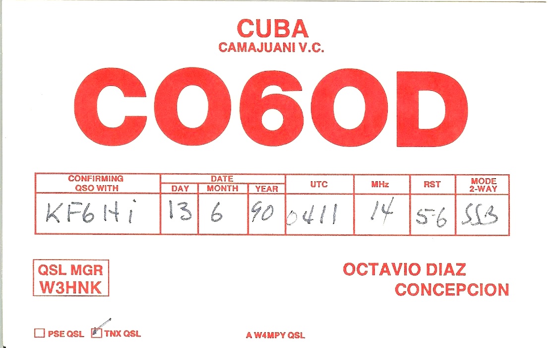 KF6HI QSO with CO6OD (click for QRZ info), information for above highlighted contact: