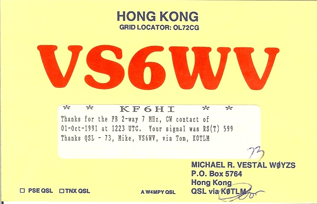 | VS6WV | 1991-10-01 | 12:50 | CW | Y | Y | N | N |