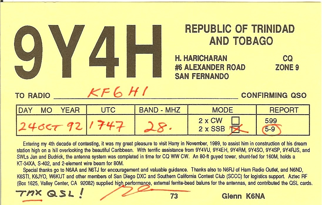 KF6HI QSO with 9Y4H (click for QRZ info), information for above highlighted contact: