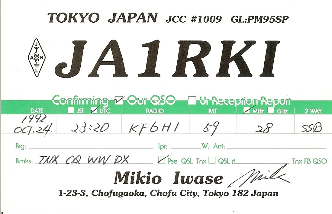 KF6HI QSO with JA1RKI (click for QRZ info), information for above highlighted contact: