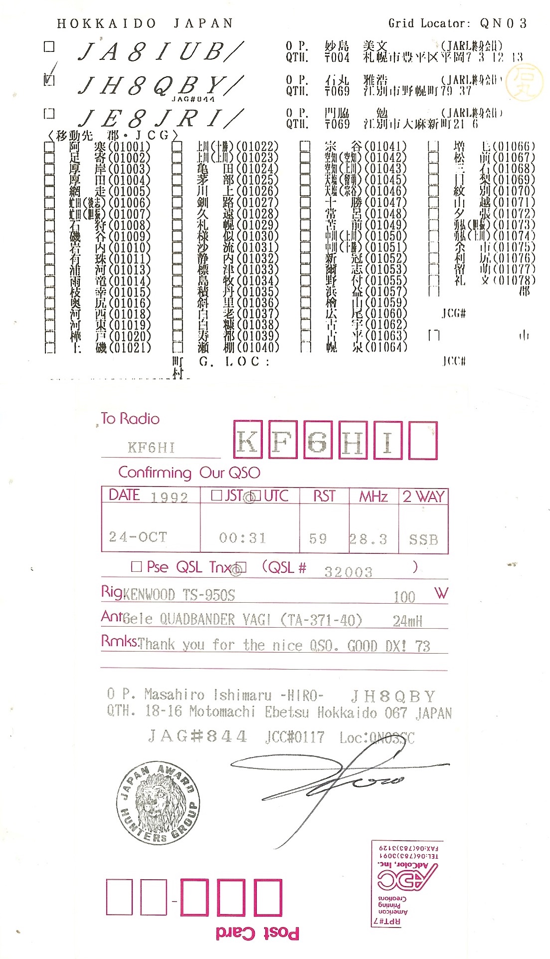 KF6HI QSO with JH8QBY (click for QRZ info), information for above highlighted contact: