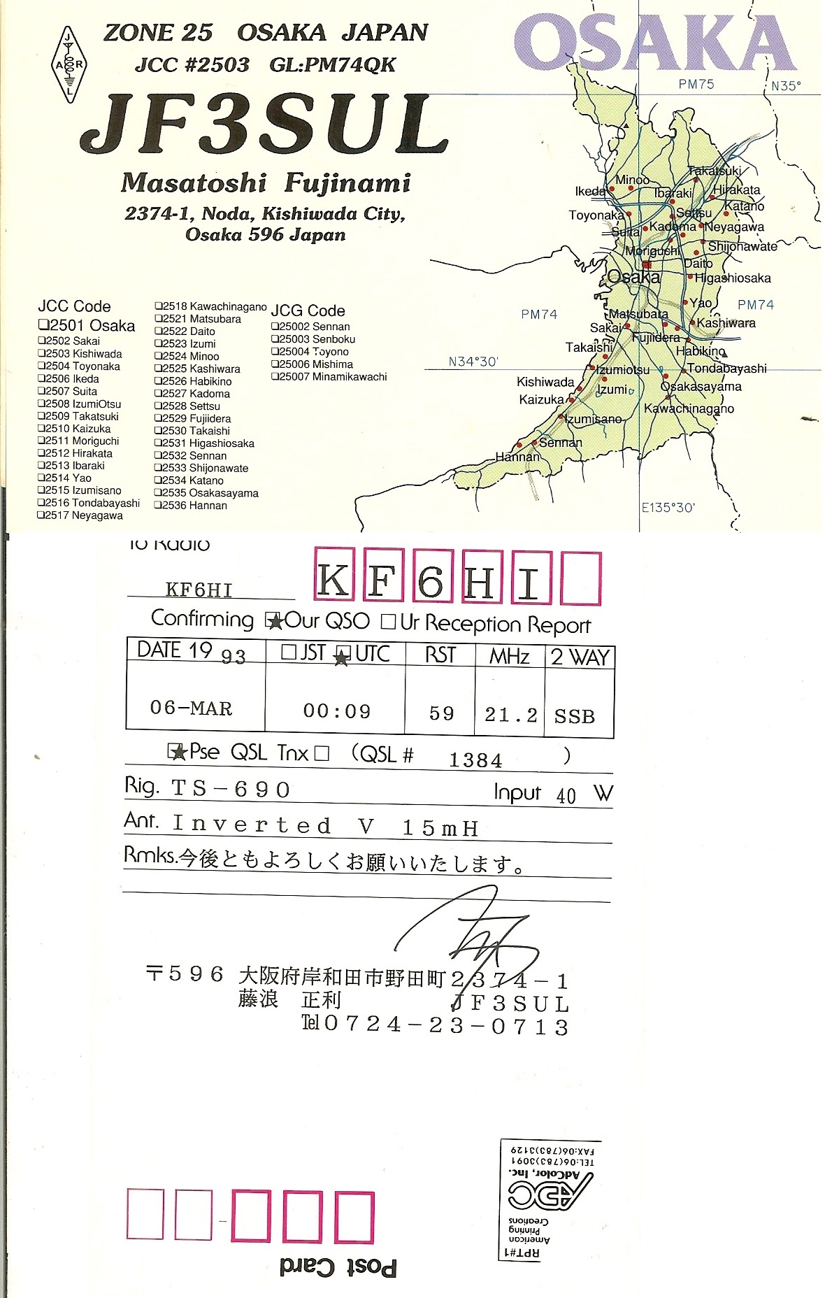 KF6HI QSO with JF3SUL (click for QRZ info), information for above highlighted contact: