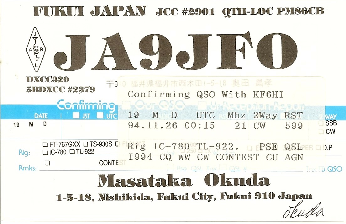 KF6HI QSO with JA9JFO (click for QRZ info), information for above highlighted contact: