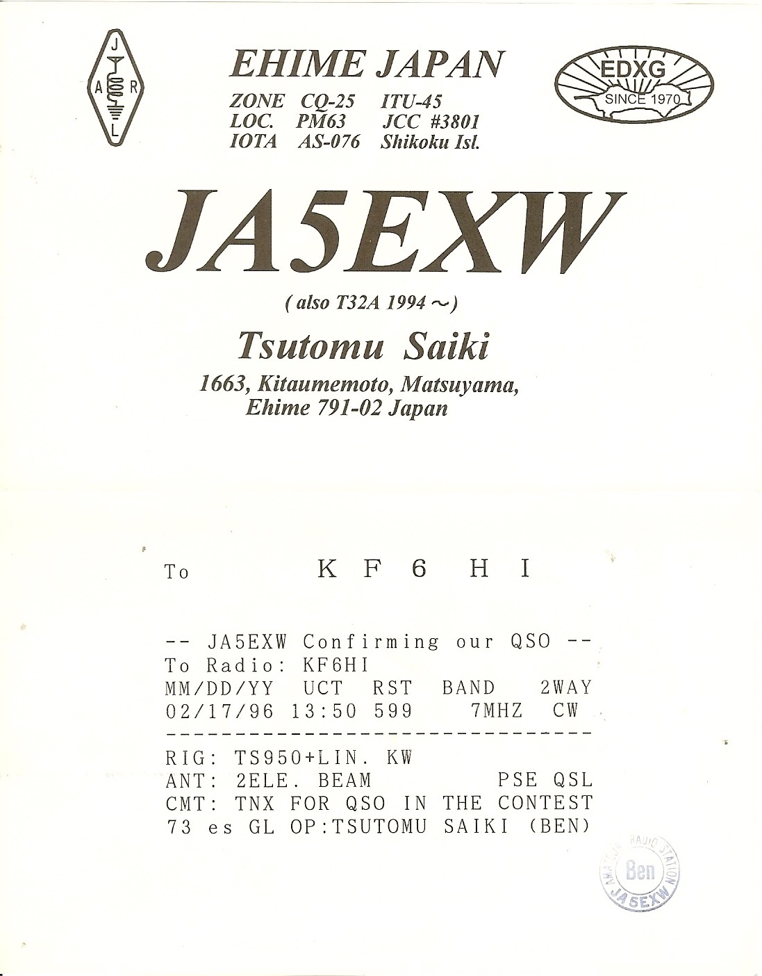KF6HI QSO with JA5EXW (click for QRZ info), information for above highlighted contact: