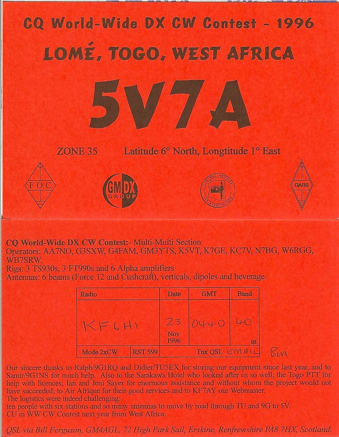 Number of QSOs found on 7 MHz with Togo : 1 | |||||||||||||||||