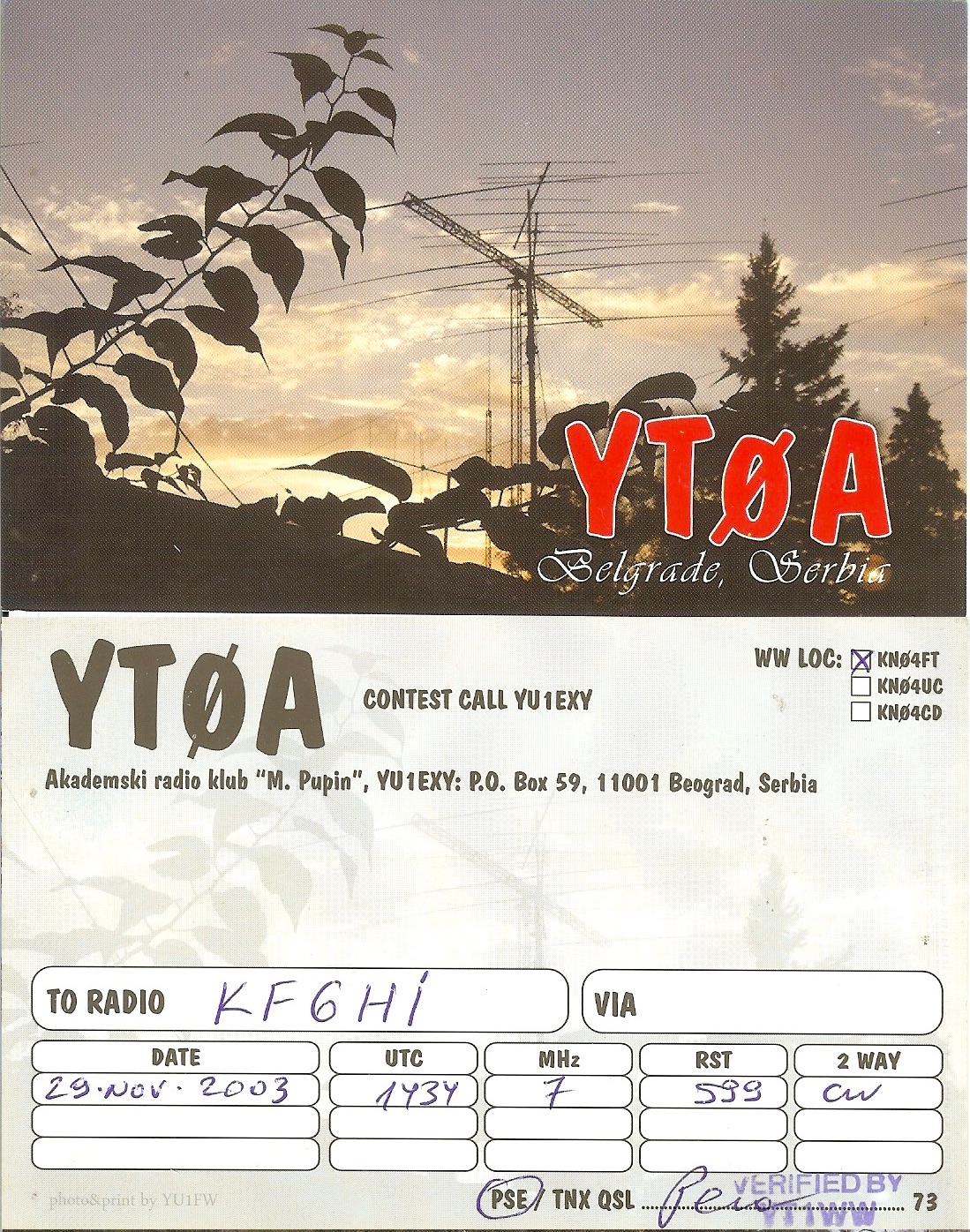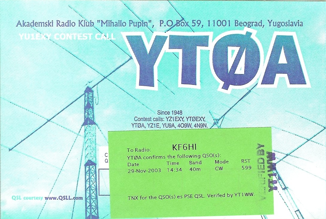 KF6HI QSO with YT0A (click for QRZ info), information for above highlighted contact:
