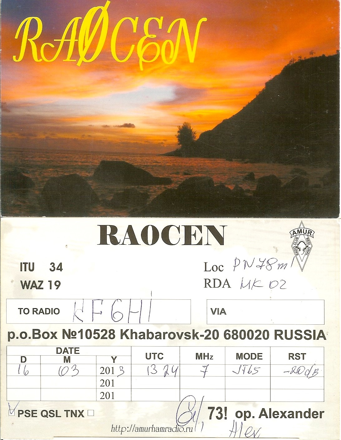 KF6HI QSO with RA0CEN (click for QRZ info), information for above highlighted contact: