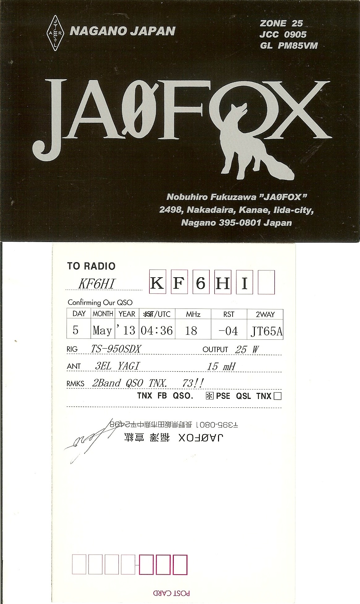 KF6HI QSO with JA0FOX (click for QRZ info), information for above highlighted contact: