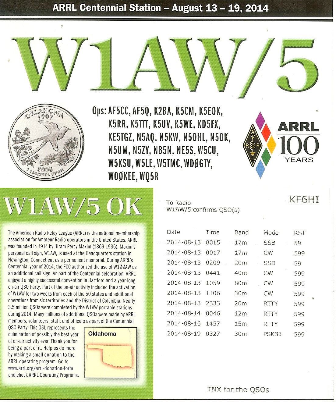 KF6HI QSO with W1AW/5 (click for QRZ info), information for above highlighted contact: