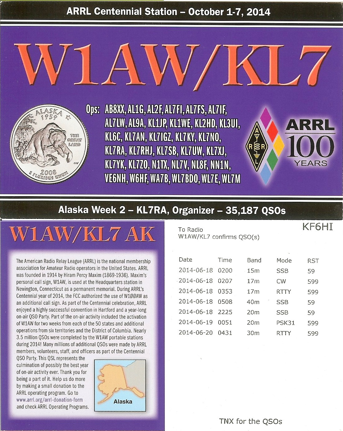 KF6HI QSO with W1AW/KL7 (click for QRZ info), information for above highlighted contact: