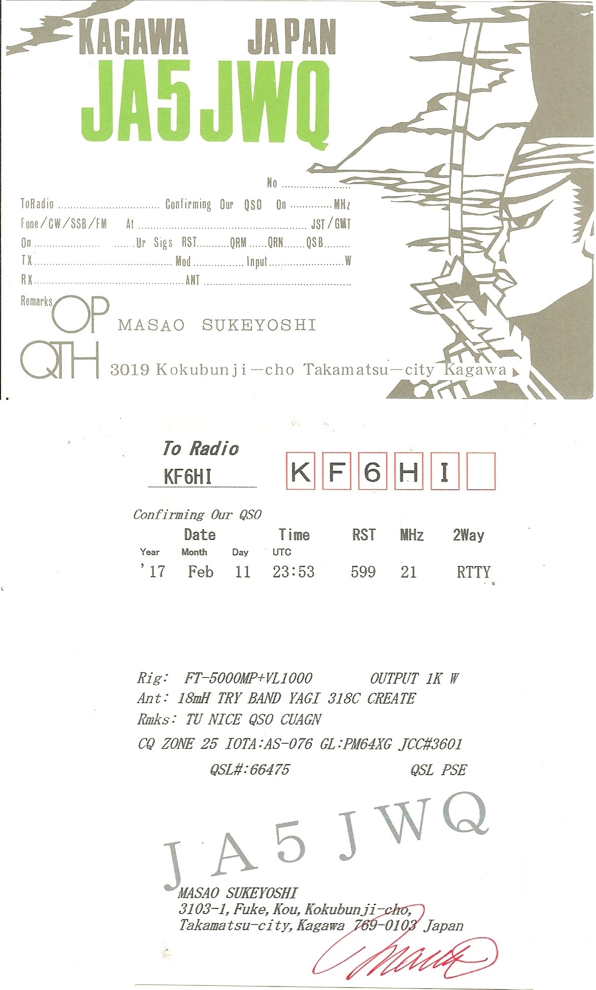 KF6HI QSO with JA5JWQ (click for QRZ info), information for above highlighted contact: