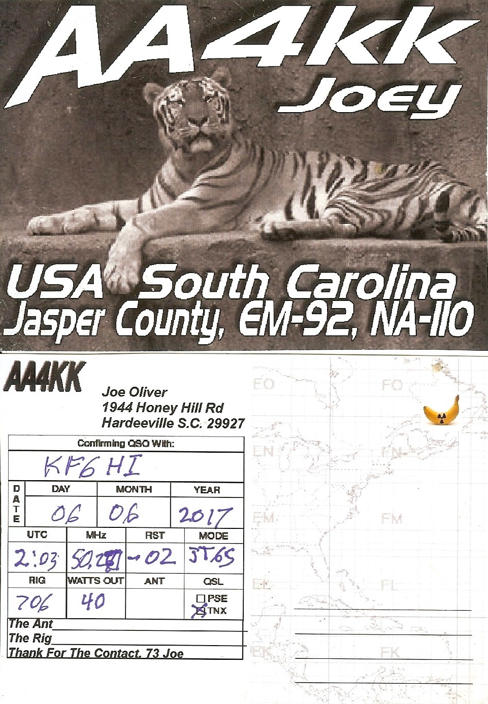 AA4KK | 2017-06-06 | 02:03 | JT65 | Y | Y | Y | N |