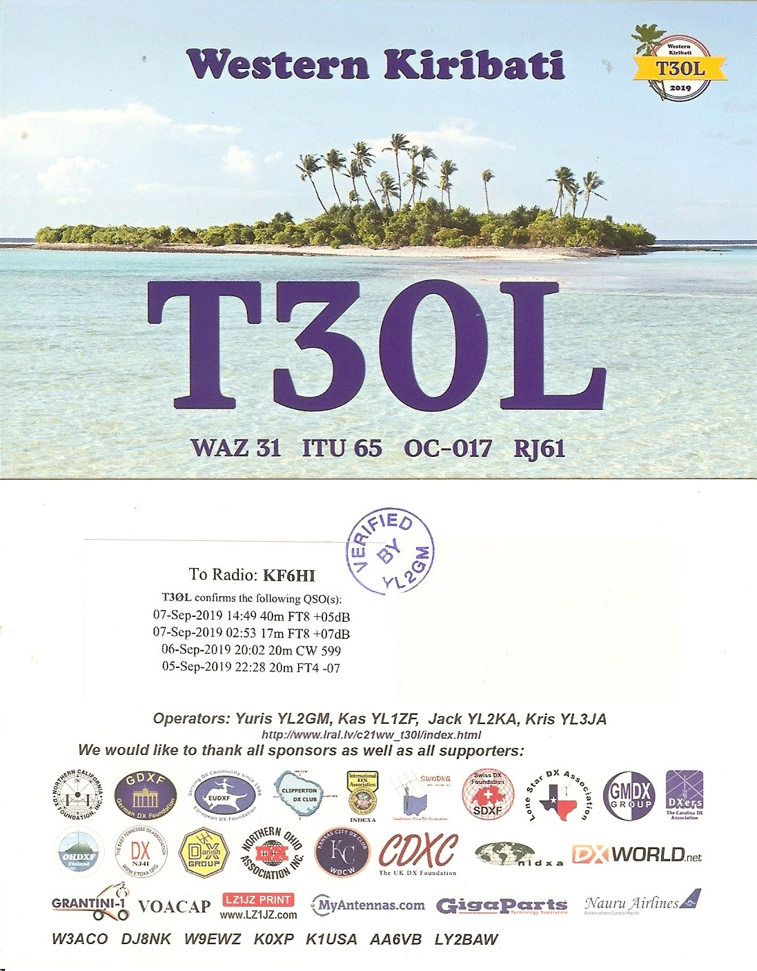 | Number of QSOs found on 18 MHz with W. Kiribati (Gilbert Is. ) : 6 | |||||||||||||||||||||||||||||||||||||||||||||||||||||||||