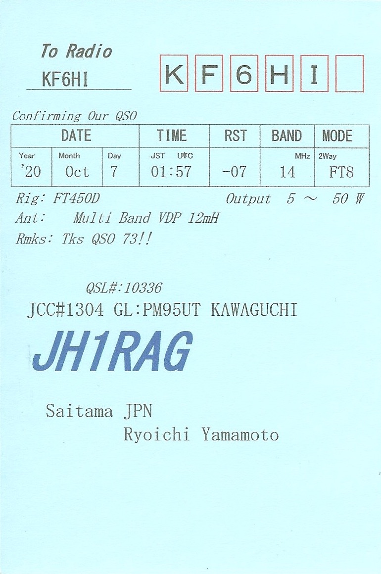 KF6HI QSO with JH1RAG (click for QRZ info), information for above highlighted contact: