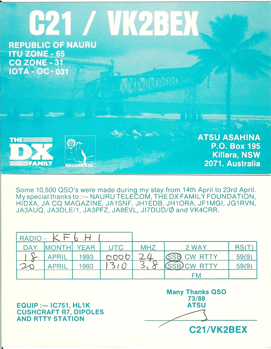 KF6HI QSO with C21/VK2BEX (click for QRZ info), information for above highlighted contact:
