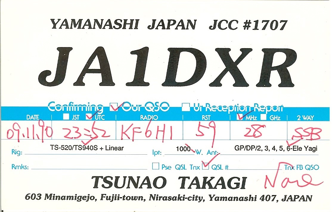 KF6HI QSO with JA1DXR (click for QRZ info), information for above highlighted contact: