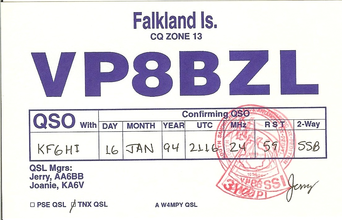 | Number of QSOs found on 24.5 MHz with Falkland Is. : 2 | |||||||||||||||||||||||||
