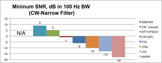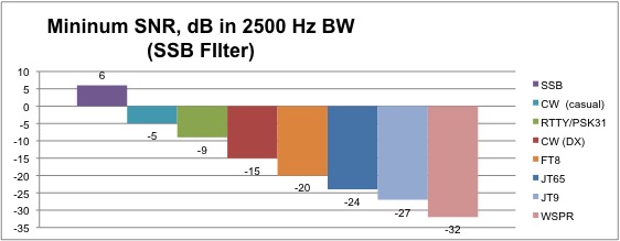 Signal to Noise Ratio (SNR) is a figure of merit that compares the level of a desired signal to the level of background noise. It is calculated as the ratio of signal power to the noise power. SNR is expressed in dB (decibles). For loud signals you can roughly calculate SNR off the S-meter. If a received CW signal is S9 and the meter reads S7 without a signal, the SNR is 12dB (normally each S-unit is 6dB). Let's say this signal is received through a wide receiver filter bandwidth of 2400 Hz. Now apply the narrow 500 Hz CW filter. The noise reading should go down to just under S6 for a 6.8dB improvement. This is the ratio of the two bandwidths. The narrow bandwidth filters out more noise so your SNR improves. The SNR is now 18.8 dB. Note however that the signal of interest must still fully pass through the filter. Passing an SSB signal that is nominally 2300Hz wide through a 500 Hz filter would make the signal unintelligible. Noise is throughout the radio frequency spectrum. It can be dominated by external noise received by the antenna (the usual case for RF signals < 30MHz, HF) or by the internal noise added by the receiving system (the usual case for signals >30MHz, VHF, UHF). From Figure 1 you can see that noise is a broadband signal and to measure its power we must specify the bandwidth it is measured in, known as the Noise Bandwidth (NBW). ![]() Figure 1: Comparison of different SNRs. Signal power (red) is compared to noise power in a received bandwidth (blue) SSB signals are normally received through either a 2600 Hz or 2400 Hz filter. Across the amateur radio community 2500 Hz has been adopted as a figure of merit for comparing the receiving capability of a mode. By mode I am referring to SSB, CW, RTTY, JT65, etc. There are pros and cons to the use of each mode. For instance SSB is a signal that is 2300 Hz wide. If you put in smaller filters you start to loose signal energy in addition to lowering the noise energy. This loss of signal will quickly make the SSB signal unintelligible. Bandwidth becomes the limiting factor for the SSB mode. CW is a much narrower signal. Common filters used include 2400Hz, 500Hz, 250Hz, and 100Hz. With DSP (Digital Signal Processing) you can even go narrower. Essentially this is what all of the new DSP modulation schemes are doing. They are doing DSP to narrow the noise bandwidth as tight to the signal as possible. In addition to this they are also encoding the signal. Encoding means they are putting in redundant information and/or reducing the alphabet, or known outcomes*1, of the decoded signal. Encoding improves the data recovery of a signal at a given SNR. The scope of encoding the signal is beyond this discussion. Concentrating on HF amateur communications a DXer is focused on long distance, usually weak, signals. Different modulation modes inherently have different performance on weak signals. Let's look at some common modes used for DXing. It is common in the amateur radio literature to express SNR performance, ie the ability to hear and decode weak signals, in dB releative to noise in a 2500 Hz bandwidth. This is what we show in Figure 2. ![]() Figure 2: SNR performance referenced to casual copy SSB signal in 2500 Hz As shown in Figure 2 a 6dB SNR is required for casual SSB communications. A just barely understandable SSB signal (recoginize your call and pull in a signal report) would be 0 db SNR. Note that when we do these SNR comparisons it is on a clear channel. No QRM, no static crashes, no fading. To compensate for these channel characteristics we would need a higher SNR. Looking at Figure 2 we see for casual CW operation the signal can be 11 dB lower or -5 dB SNR for the same intelligibility as casual SSB. But what does -5 db mean? Doesn't that mean the signal is below the noise? How can you hear that! Remember this is relative to a 2500 Hz bandwidth. You would normally click in a 500 Hz filter and now the -5dB becomes 1.8dB. That's good enough to copy CW. Still too noisy for you? click in the 250 Hz filter and now you have SNR=4.8dB. In Figure 3 we have recalculated the data in reference to a 100Hz filter. That CW signal that had -5 db SNR in 2500 Hz now has an SNR of 9dB. For A DXer with good ears who is trying to confirm their call and signal report they can go down to -1dB SNR (the brain does some of it's own DSP on the signal). Also, when you are only looking for you call and a signal report to come back, you are in effect reducing the alphabet - and gaining some decoding benefit. For a discussion of what CW SNRs are copyable, see the The Weak-Signal Capability of the Human Ear by Ray Soifer, W2RS. ![]() Figure 3: SNR performance referenced to minimal copy CW signal in 100 Hz For better SNR performance you need to use one of the DSP modes. JT651 was initially developed for EME communications where the signal is very weak. JT65A has been adapted for HF use as JT65-HF2. From Figure 2 you can see that if your JT65A SNR is reported as -15 or lower you are receiving a signal that is too weak for conventional CW reception. Using JT65 you can increase your reception of signals by 9 db (24-15). When using this mode note that it will never report a signal greater than -1dB. The software caps the reporting of strong signals at this level. This goes back to what JT65 was originally designed for: EME. The DSP code as written does not know what to do with a positive SNR signal3. In my experience anything reported as -10 or larger is a suspect SNR. WSPR4 is not a two-way communications mode, but a Beacon mode. Narrow DSP filtering and coding increases low signal reception by another 8 db. JT9 was developed after JT655. It is similiar to JT65 but is much narrower and boasts better performance. Unlike JT65 it was specifically designed for HF operation. It will report positive SNRs. FT8 was recently developed to mitigate fading during Sporadic-E communications on 6 meters, however it has seen widespread acceptance by the Ham Radio community across th